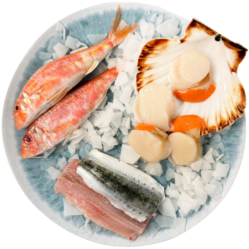 Nous proposons une gamme de poissons frais de saison, sélectionnés selon les arrivages et les périodes de pêche, incluant notamment le rouget barbet, le maquereau, la Saint-Jacques, les encornets, etc..
